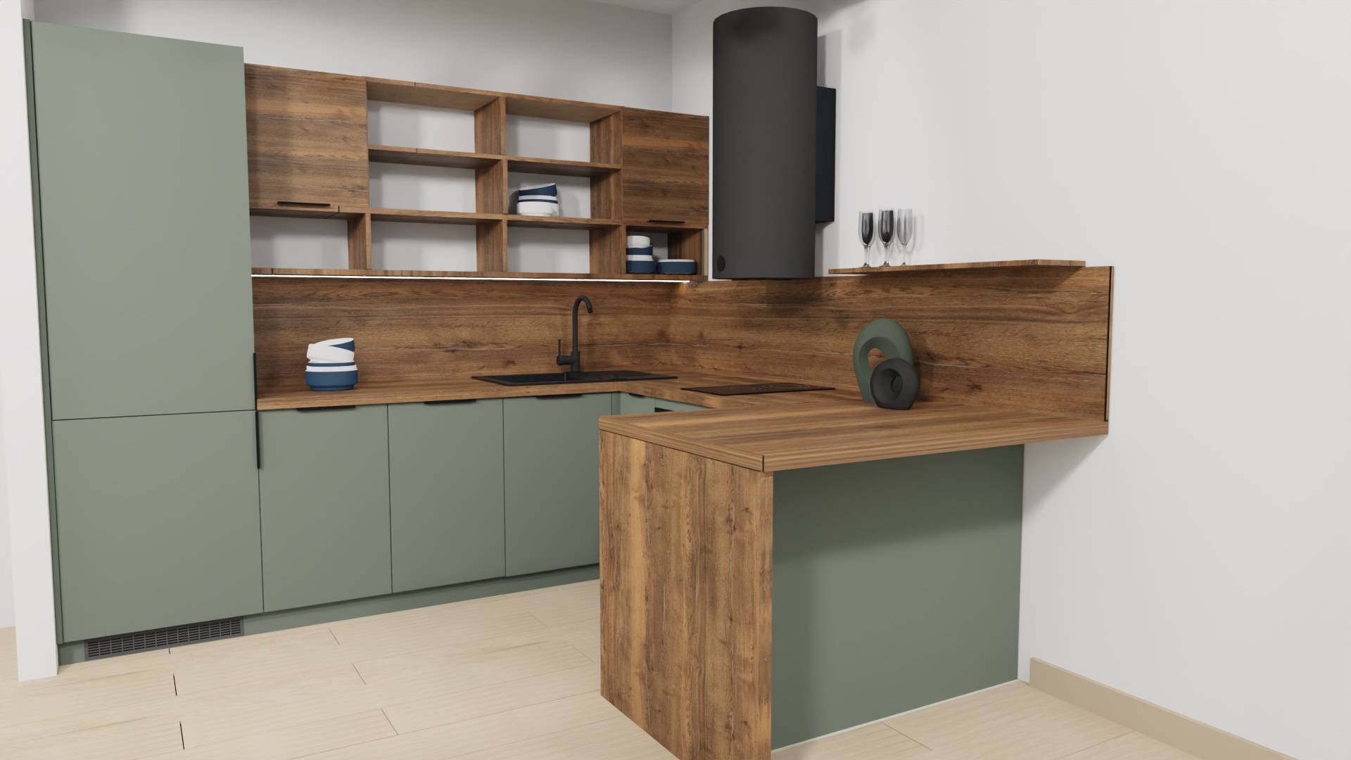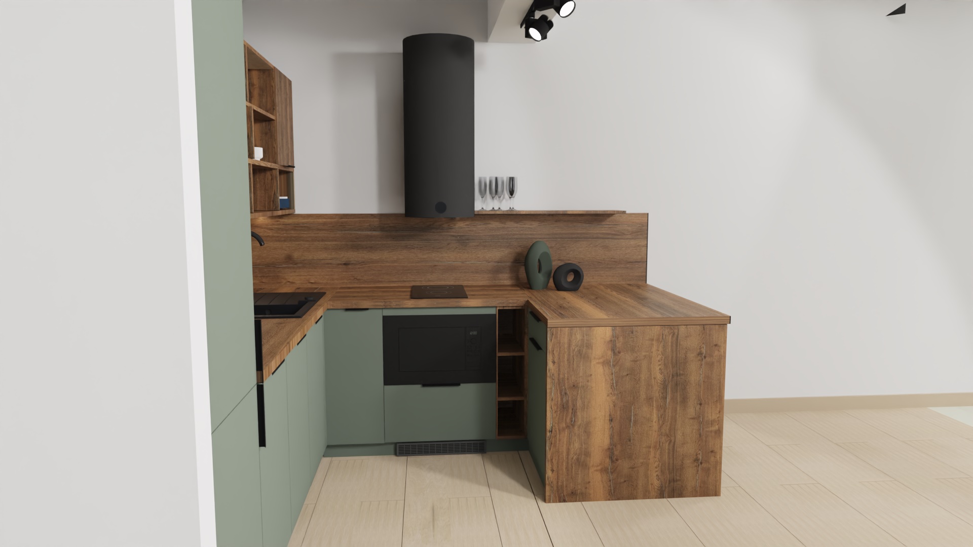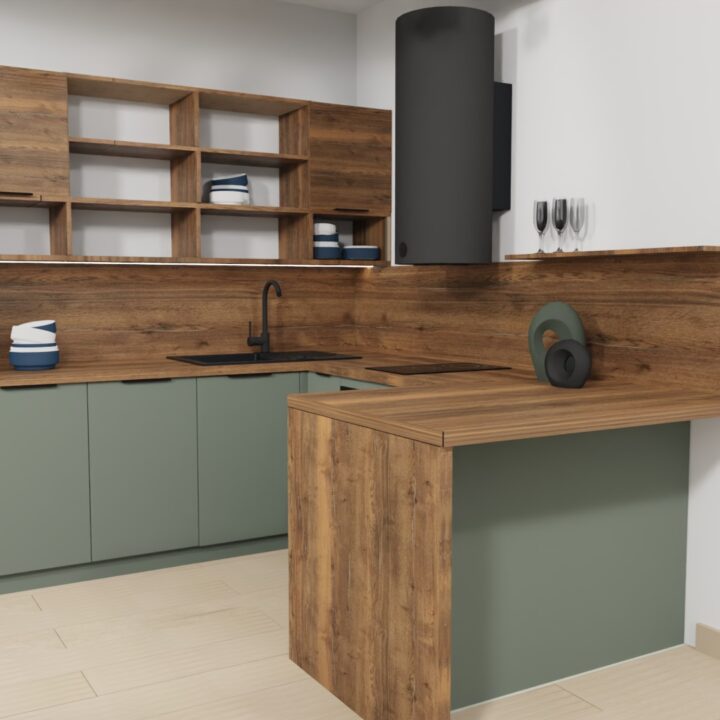 Pierwsza kuchnia utrzymana jest w odcieniach zieleni, uzupełniona efektownym, dekoracyjnym blatem, który stanowi centralny punkt aranżacji.